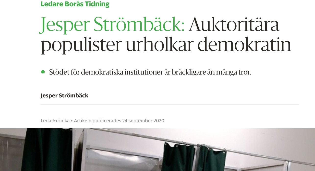 Detta är också temat för min senaste krönika i Borås Tidning. I den diskuterar jag även forskning som visar att många människor – även i Sverige – antingen inte har särskilt goda kunskaper om vad demokrati innebär eller att de är villiga att inskränka centrala demokratiska fri- och rättigheter. Rubriken på krönikan är Auktoritära populister urholkar demokratin.