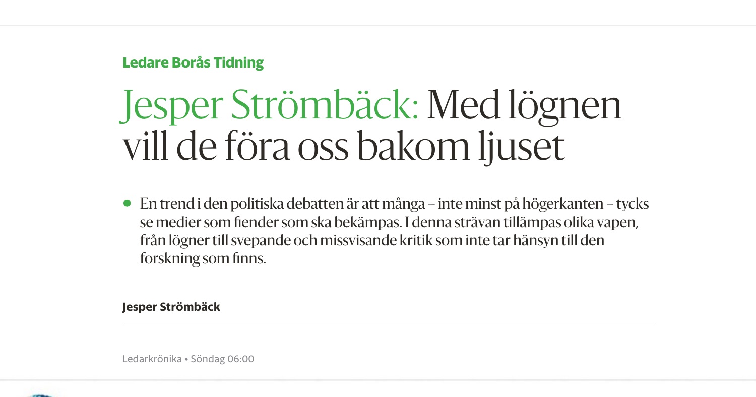 Nu har min senaste krönika i Borås Tidning publicerats. I den tar jag upp att allt fler – inte minst på högerkanten – tycks se medierna som fiender som ska bekämpas. I det sammanhanget är det många som inte drar sig för att använda lögner eller svepande och missvisande kritik byggd på selektiv ”anekdotisk bevisföring” samtidigt som de bortser från den forskning som finns. Rubriken på krönikan är Med lögnen vill de föra oss bakom ljuset.