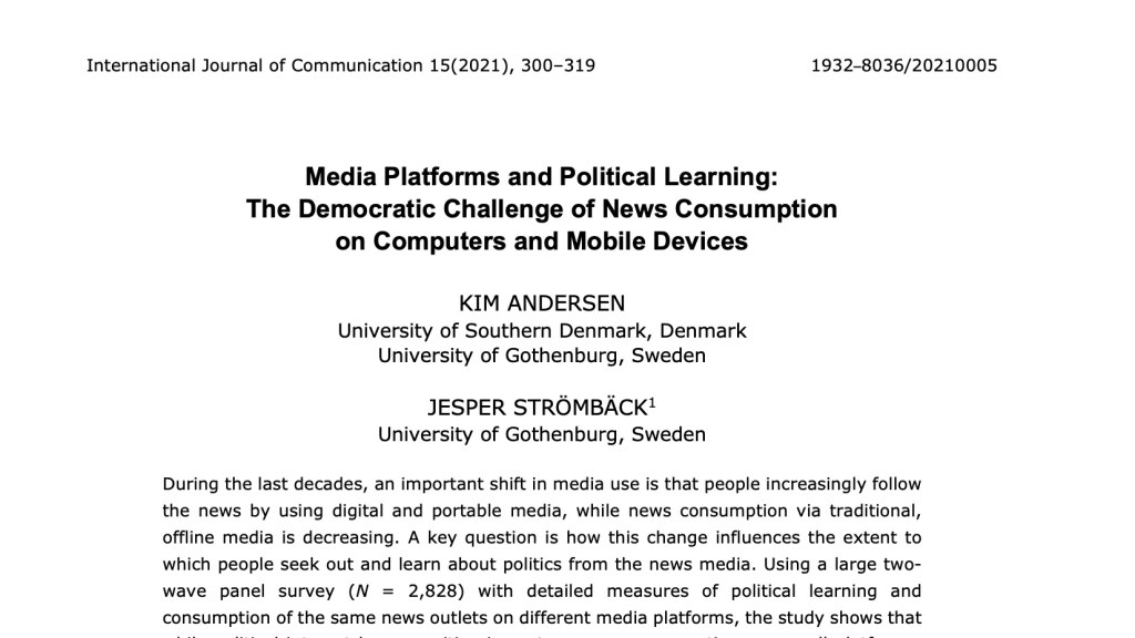 Detta är grundfrågan i en ny artikel, skriven tillsammans med Kim Andersen och precis publicerad i International Journal of Communication. Titeln på artikeln är Media Platforms and Political Learning: The Democratic Challenge of News Consumption on Computers and Mobile Devices.