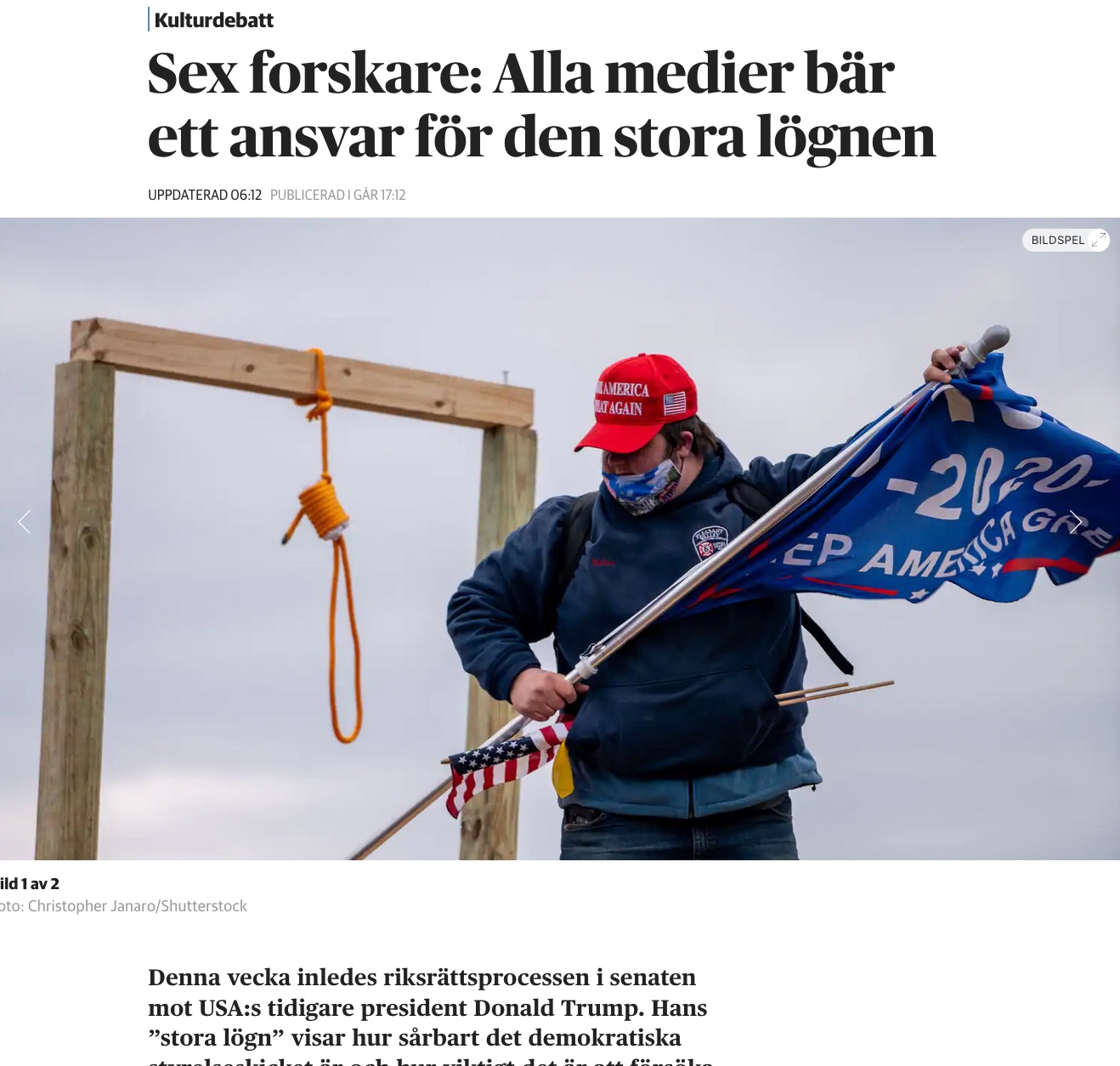 Den här veckan inleds den andra riksrättsprocessen mot Donald Trump. Bakgrunden är stormningen av kongressen den 6 januari i ett försök av Trumpanhängare att förhindra bekräftandet av Joe Biden som USA:s 46:e president. Dessa eldades på av Trump och den återkommande lögnen om valfusk och att Trump egentligen vann valet. Denna ”stora lögn” har dessvärre varit effektiv: en rad olika opinionsundersökningar visar att en majoritet av republikanska väljare tror att valet var stulet.