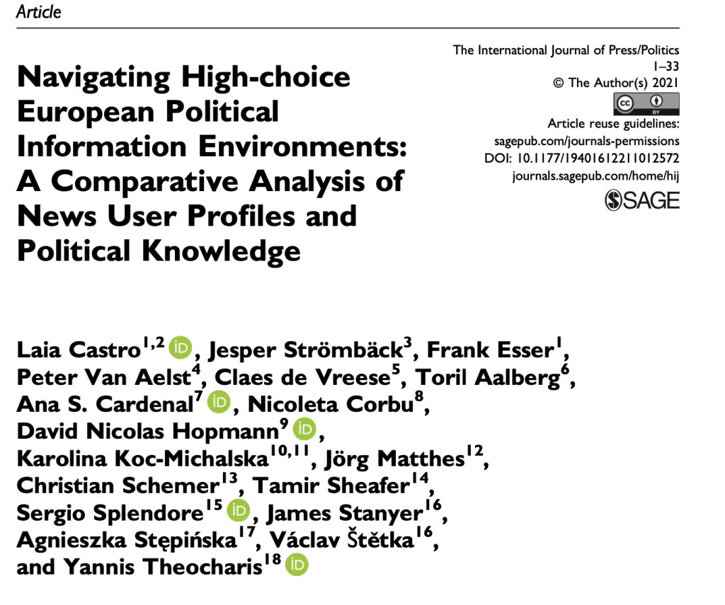 I veckan som gick publicerades pappret även i International Journal of Press/Politics med titeln Navigating High-Choice European Political Information Environments: A Comparative Analysis of News User Profiles and Political Knowledge. Baserat på den ovan nämnda panelundersökningen syftar studien till att (a) undersöka vilka nyhetsanvändarprofiler som kan identifieras i de olika länderna och (b) sambanden mellan olika nyhetsanvändarprofiler och människors politiska kunskaper.