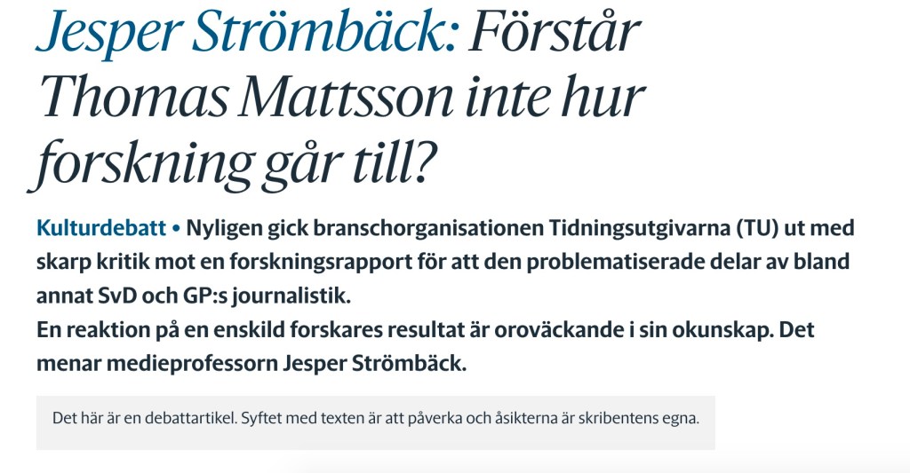 Den kritiken vilar dock på en felaktig premiss, nämligen att det är Delmi och inte forskaren i fråga som pekar ut vissa ledarsidor. Det i sin tur visar att TU har en bristande förståelse av vad akademisk frihet handlar om, vilket är mer häpnadsväckande och oroväckande än den policy brief som Delmi släppte. Det fick mig att skriva en debattartikel för GP Kultur, som publicerades idag med rubriken Förstår Thomas Mattson inte hur forskning går till?