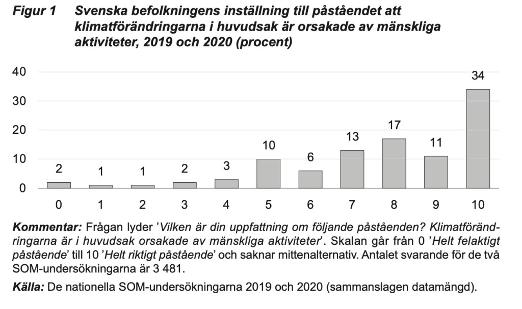 Idag släpptes SOM-institutet vid Göteborgs universitet den senaste SOM-boken, i år kallad Ingen anledning till oro(?). I den medverkar jag med ett kapitel skrivet tillsammans med Henrik Oscarsson och Erik Jönsson, i vilket vi undersöker den svenska befolkningens uppfattningar om huruvida klimatförändringarna huvudsakligen är orsakade av mänskliga aktiviteter. Bland mycket annat visar resultaten den övervägande majoriteten av befolkningen anser att klimatförändringarna i huvudsak är orsakade av människan. Samtidigt finns en minoritet på cirka sex procent som inte anser detta och som – givet vad klimatforskningen visar – framstår som kunskapsresistenta vad gäller den här frågan. Det kan låta lite, men om man leker med tanken att de skulle samlas i ett eget parti skulle det få fler röster än såväl Liberalerna som Miljöpartiet, och ungefär lika många som Kristdemokraterna. Det är alltså ingen obetydligt opinion det handlar om.
