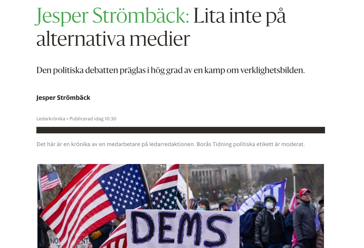 Idag var det dags för min senaste krönika i Borås Tidning. I den utgår jag från den mycket läsvärda boken ”Network Propaganda” av Yochai Benkler, Robert Faris och Hal Roberts. I den visar de bland annat att det numera existerar två mediesystem eller medieekologier i USA, där det ena är präglat av en sanningsdynamik (reality feedback loops) medan det andra är präglat av en propagadadynamik (propaganda feedback loops). Medan det förra omfattar traditionella medier omfattar det senare framförallt en flora högerinriktade alternativa medier. Fast begreppet ”alternativa medier” är på många sätt missvisande. Istället för att ses som en form av medier borde de ses som politiska aktörer.