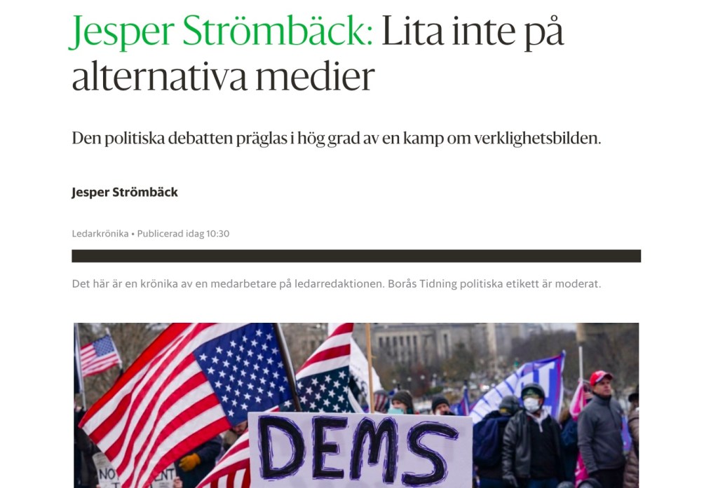 Utvecklingen i Sverige har inte gått lika långt, men även här finns som bekant en bred flora av olika högerinriktade medier, de flesta online, och enskilda aktörer som lajvar journalister. Jag tänker då på ”politiskt alternativa medier” som bland annat Riks, Samhällsnytt, Bulletin med flera. Även här är det tydligt att det ingår i en strategi att skapa ett alternativt mediesystem till det traditionella. Och även här präglas de av propagandadynamik snarare än sanningsdynamik.
