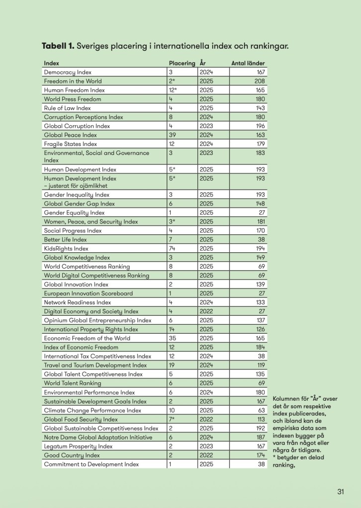 I den nya rapporten Mellan myt och mätning – Sverige i en internationell jämförelse (Futurion) jämför jag därför hur Sverige rankas i totalt 43 internationella rankingar. Det är den tredje rapporten på det temat, efter Mellan skönmålning och svartmålning – Sverige i en internationell jämförelse (2017) och Bortom kampen om verklighetsbilden – Sverige i en internationell jämförelse (2022). Liksom tidigare handlar dessa rankingar om allt från allt från demokrati och mänskliga fri- och rättigheter, mänsklig utveckling, jämställdhet och social rättvisa till ekonomi, konkurrenskraft och företagande, ekologisk och socialt hållbar utveckling samt välmående och bidrag till världen. Nytt för den här studien är att jag även jämför hur Sveriges position har förändrats sedan den senaste rapporten.