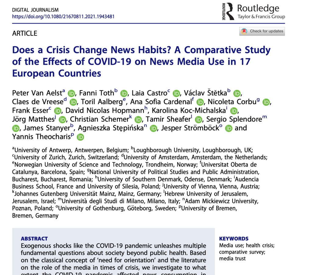 – Van Aelst, Peter, Toth, Fanni, Castro, Laia, Stetka, Vaclav, de Vreese, Claes, Aalberg, Toril, Cardenal, Ana Sofia, Corbu, Nicoleta, Esser, Frank, Hopmann, David Nicolas, Koc-Michalska, Karolina, Matthes, Jörg, Schemer, Christian, Sheafer, Tamir, Splendore, Sergio, Stanyer, James, Stepinska, Agnieszka, Strömbäck, Jesper & Theocharis, Yannis (2021). Does a Crisis Change News Habits? A Comparative Study of the Effects of COVID-19 on News Media Use in 17 European Countries. Digital Journalism, online early.